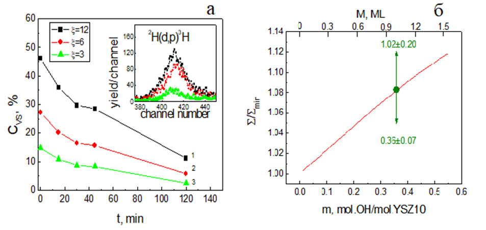 Работа посвящена разработке фотокатализаторов для зелёных технологий получения водорода из воды, они могут стать альтернативой ископаемым источникам энергии. Перспективными являются технологии, основанные на диссоциации молекул воды на поверхности оксидов, она происходит под действием солнечного света и не требует затрат энергии. Коммерческое применение известных фотокатализаторов нецелесообразно из-за их низкой эффективности. Предлагается новый подход, основанный на использовании оксидных нанопорошков, синтезированных по технологии лазерного испарения керамической мишени. Некоторые из них являются полупроводниками с малой шириной запрещённой зоны и высокой концентрацией кислородных вакансий (рис.(а)) поверхностном слое, что благоприятно для фотокатализа. С помощью методики ядерных реакций определены толщины слоёв OH- и H₂O, образующихся на поверхности нанопорошка оксида YSZ10 при его взаимодействии с влажным воздухом. Толщина слоя OH-, характеризующая эффективность фотокатализатора, составила один монослой (рис.(б)), что является теоретическим пределом для этого параметра и свидетельствует о перспективности предлагаемой технологии и материала.