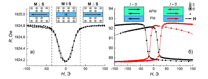 Для пленок металлов с сильным спин-орбитальным взаимодействием (Pt, WTa) и наноструктур Ta/Me/Ta (Me: FeMn, Dy, CoFe) обнаружено продольное положительное магнитосопротивление, обусловленное спиновой аккумуляцией. Показано, что магнитосопротивление наноструктур, содержащих слои металлов с различными типами магнитного упорядочения зависит от величины спинового тока, инжектированного в слой магнетика. Синтезированы спиновые клапаны на основе слоя β-W75Ta25, обладающего большой величиной спинового угла Холла. В магнитосопротивлении наноструктур обнаружены эффекты, обусловленные как спиновой аккумуляцией, так и нагревом электрическим током (рисунок). Разработана методика изменения однонаправленной анизотропии в отдельных элементах мостовой схемы путем пропускания импульсов тока.